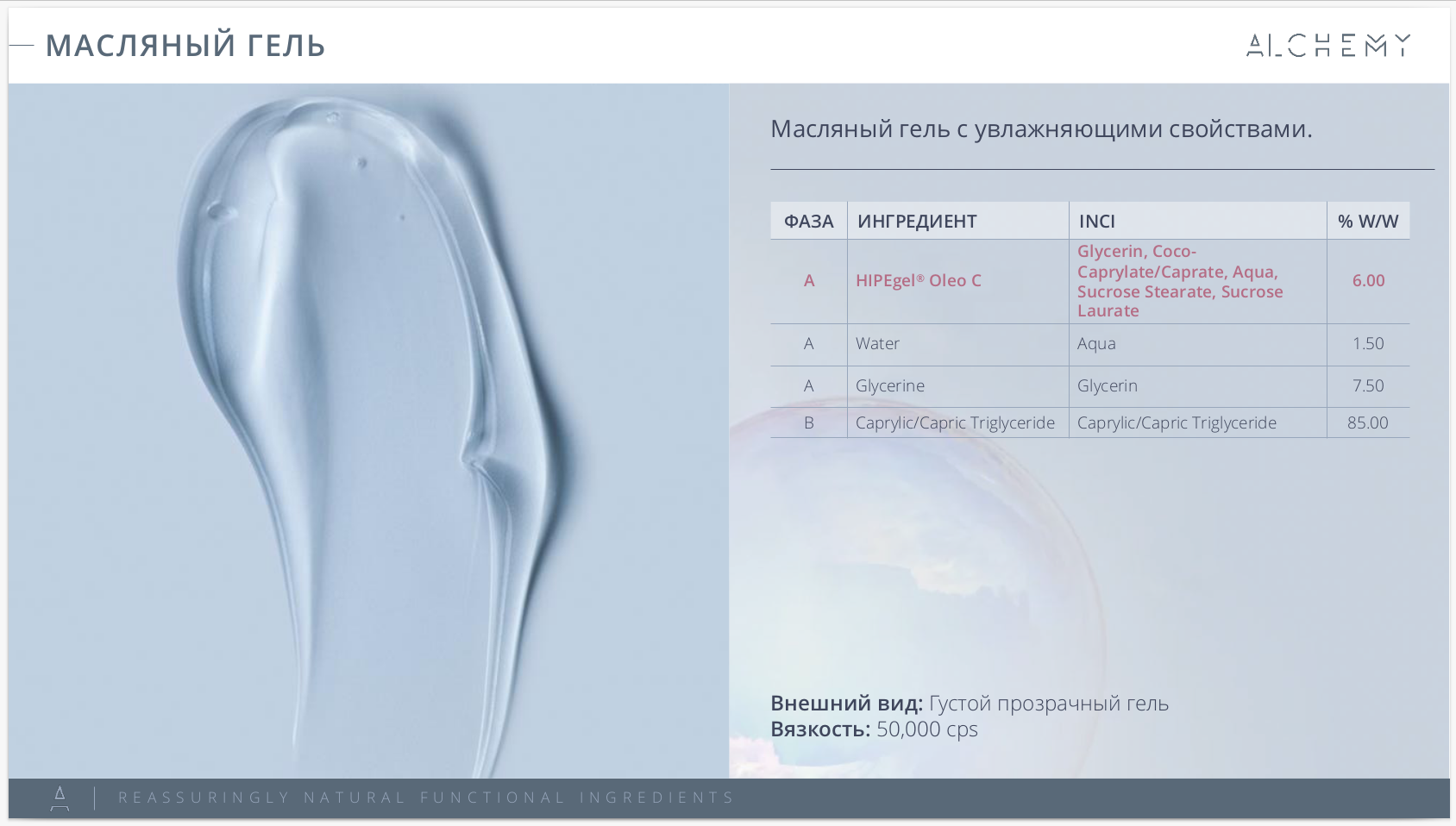 Вязкость и прозрачность регулируется % воды и глицерина (для создания прозрачного геля 6% HIPEgel Oleo C, 2 % воды и 7 % глицерина).