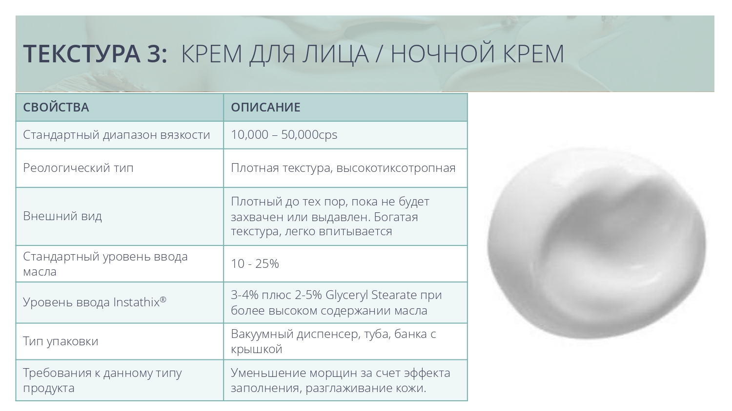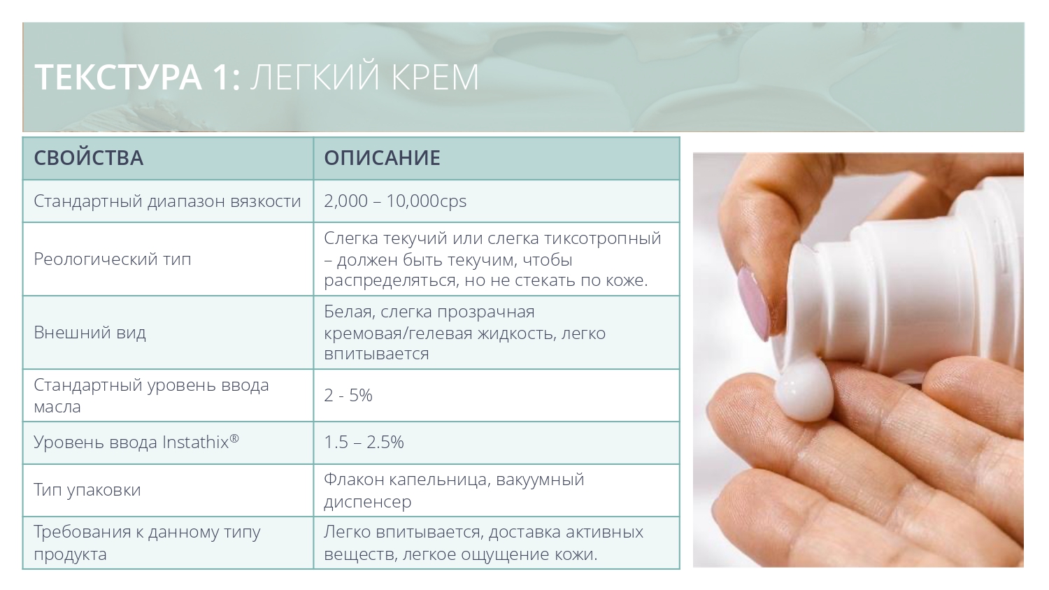 Instathix® представляет собой концентрированную порошковую смесь натуральных эмульгаторов, стабилизаторов и модификаторов текстуры, позволяющую легко получать стабильные эмульсий типа "масло-в-геле". С ним можно создавать как жидкие сыворотки с шелковистой гладкой текстурой, так и более насыщенные и густые кремы и баттеры. Кроме того, этот ингредиент можно использовать для решения проблем, связанных с повышением вязкости или улучшением стабильности и текстуры уже готовых рецептур.