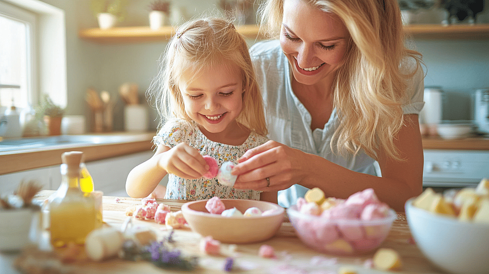 | Детская праздничная | Разноцветный глиттер (биоразлагаемый), конфетти из мыльной основы. | Только 3-4 капли безопасного масла мандарина или ванили (аромамасла). Эфирные масла для детей используйте с крайней осторожностью! | Использовать фигурные формы (звездочки, сердечки, зверушки). |